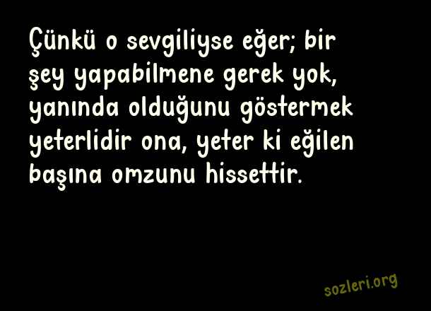 Çünkü o sevgiliyse eğer; bir şey yapabilmene gerek yok, yanında olduğunu göstermek yeterlidir ona, yeter ki eğilen başına omzunu hissettir. ( Yanında Olmak )