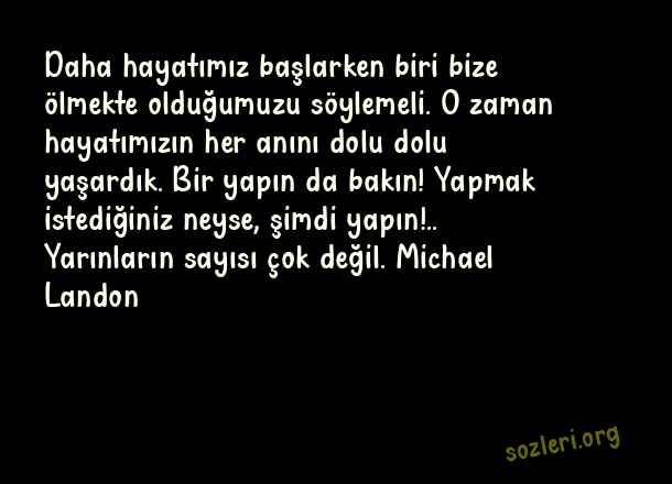 Daha hayatımız başlarken biri bize ölmekte olduğumuzu söylemeli. O zaman hayatımızın her anını dolu dolu yaşardık. Bir yapın da bakın! Yapmak istediğiniz neyse, şimdi yapın!.. Yarınların sayısı çok değil. Michael Landon ( Anı Yaşamak )