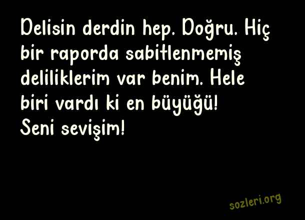 Delisin derdin hep. Doğru. Hiç bir raporda sabitlenmemiş deliliklerim var benim. Hele biri vardı ki en büyüğü! Seni sevişim! ( Canım Yanıyor )
