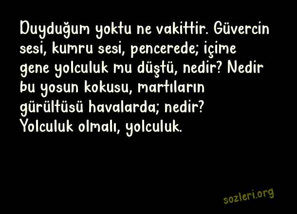 Duyduğum yoktu ne vakittir. Güvercin sesi, kumru sesi, pencerede; içime gene yolculuk mu düştü, nedir? Nedir bu yosun kokusu, martıların gürültüsü havalarda; nedir? Yolculuk olmalı, yolculuk. ( Orhan Veli Kanık )
