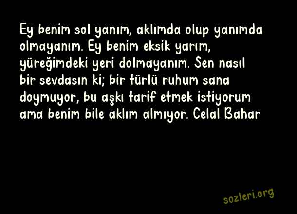 Ey benim sol yanım, aklımda olup yanımda olmayanım. Ey benim eksik yarım, yüreğimdeki yeri dolmayanım. Sen nasıl bir sevdasın ki; bir türlü ruhum sana doymuyor, bu aşkı tarif etmek istiyorum ama benim bile aklım almıyor. Celal Bahar ( Sol Yanım )