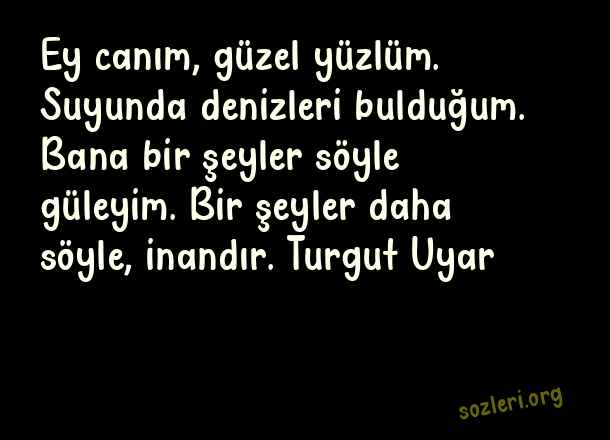 Ey canım, güzel yüzlüm. Suyunda denizleri bulduğum. Bana bir şeyler söyle güleyim. Bir şeyler daha söyle, inandır. Turgut Uyar ( Canım )