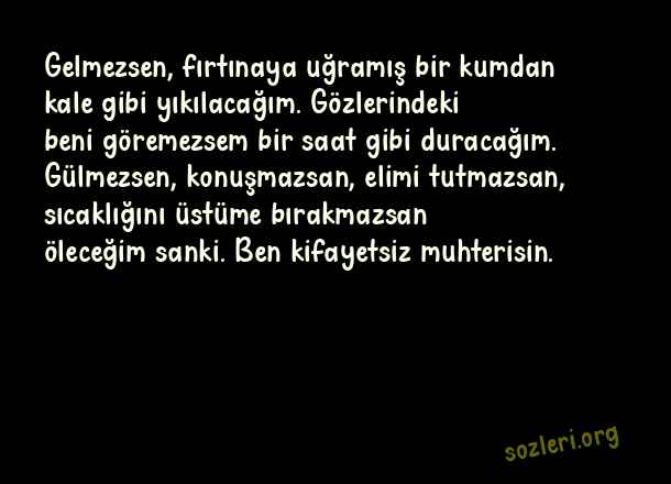 Gelmezsen, fırtınaya uğramış bir kumdan kale gibi yıkılacağım. Gözlerindeki beni göremezsem bir saat gibi duracağım. Gülmezsen, konuşmazsan, elimi tutmazsan, sıcaklığını üstüme bırakmazsan öleceğim sanki. Ben kifayetsiz muhterisin. ( Aşk İlanı )