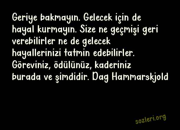 Geriye bakmayın. Gelecek için de hayal kurmayın. Size ne geçmişi geri verebilirler ne de gelecek hayallerinizi tatmin edebilirler. Göreviniz, ödülünüz, kaderiniz burada ve şimdidir. Dag Hammarskjold ( Anı Yaşamak )