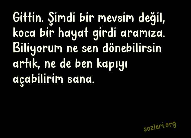 Gittin. Şimdi bir mevsim değil, koca bir hayat girdi aramıza. Biliyorum ne sen dönebilirsin artık, ne de ben kapıyı açabilirim sana. ( Canım Yanıyor )