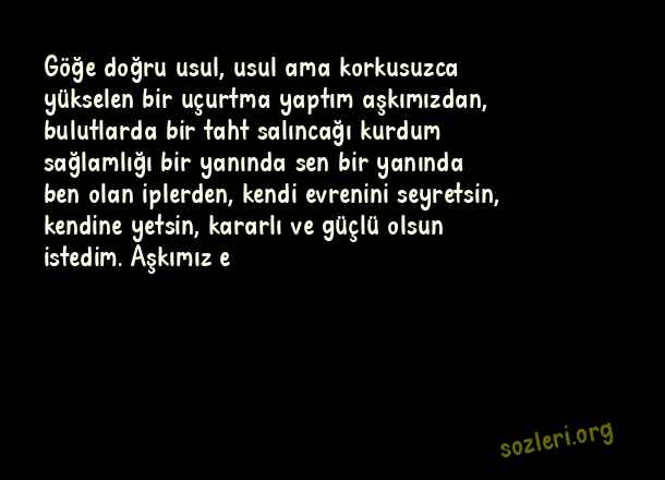 Göğe doğru usul, usul ama korkusuzca yükselen bir uçurtma yaptım aşkımızdan, bulutlarda bir taht salıncağı kurdum sağlamlığı bir yanında sen bir yanında ben olan iplerden, kendi evrenini seyretsin, kendine yetsin, kararlı ve güçlü olsun istedim. Aşkımız e ( Sol Yanım )