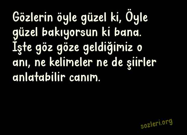 Gözlerin öyle güzel ki, Öyle güzel bakıyorsun ki bana. İşte göz göze geldiğimiz o anı, ne kelimeler ne de şiirler anlatabilir canım. ( Canım )