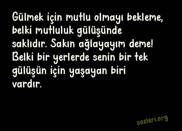 Gülmek için mutlu olmayı bekleme, belki mutluluk gülüşünde saklıdır. Sakın ağlayayım deme! Belki bir yerlerde senin bir tek gülüşün için yaşayan biri vardır. ( Dayanılmaz Aşk )