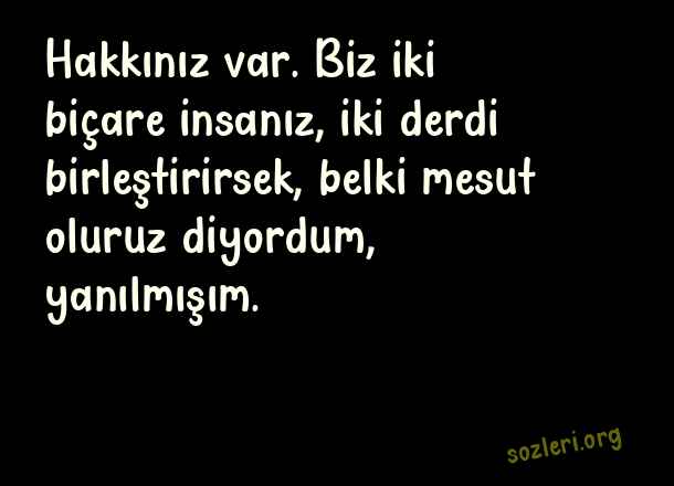 Hakkınız var. Biz iki biçare insanız, iki derdi birleştirirsek, belki mesut oluruz diyordum, yanılmışım. ( Yanılmak )