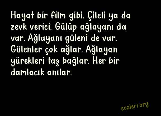 Hayat bir film gibi. Çileli ya da zevk verici. Gülüp ağlayanı da var. Ağlayanı güleni de var. Gülenler çok ağlar. Ağlayan yürekleri taş bağlar. Her bir damlacık anılar. ( Anı )