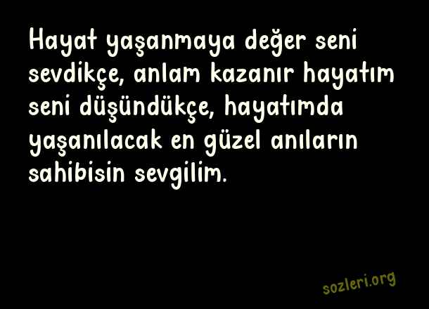 Hayat yaşanmaya değer seni sevdikçe, anlam kazanır hayatım seni düşündükçe, hayatımda yaşanılacak en güzel anıların sahibisin sevgilim. ( Anı )