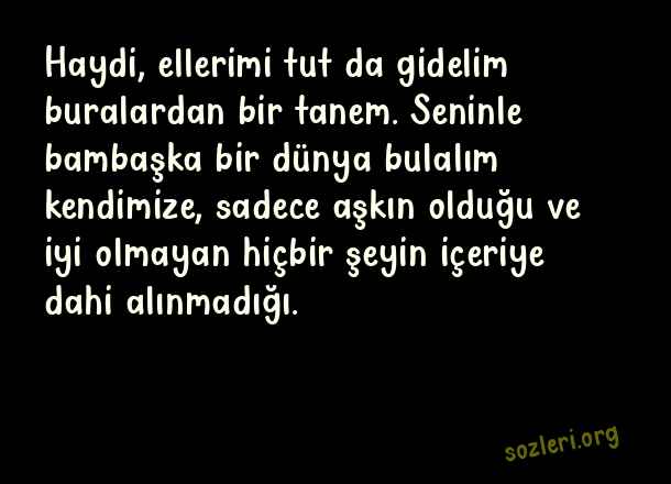 Haydi, ellerimi tut da gidelim buralardan bir tanem. Seninle bambaşka bir dünya bulalım kendimize, sadece aşkın olduğu ve iyi olmayan hiçbir şeyin içeriye dahi alınmadığı. ( Dünyanın En Romantik )
