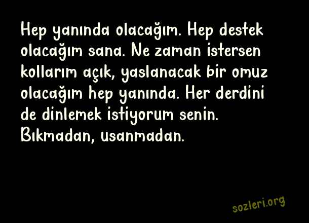 Hep yanında olacağım. Hep destek olacağım sana. Ne zaman istersen kollarım açık, yaslanacak bir omuz olacağım hep yanında. Her derdini de dinlemek istiyorum senin. Bıkmadan, usanmadan. ( Yanında Olmak )