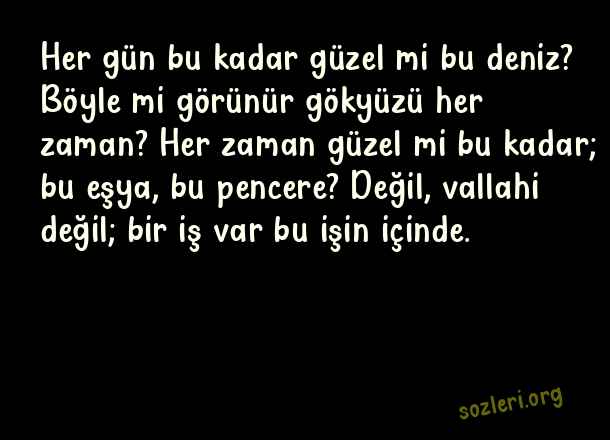 Her gün bu kadar güzel mi bu deniz? Böyle mi görünür gökyüzü her zaman? Her zaman güzel mi bu kadar; bu eşya, bu pencere? Değil, vallahi değil; bir iş var bu işin içinde. ( Orhan Veli Kanık )