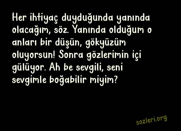 Her ihtiyaç duyduğunda yanında olacağım, söz. Yanında olduğum o anları bir düşün, gökyüzüm oluyorsun! Sonra gözlerimin içi gülüyor. Ah be sevgili, seni sevgimle boğabilir miyim? ( Yanında Olmak )