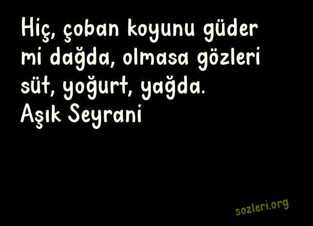 Hiç, çoban koyunu - Kullanılmak İle İlgili Sözler .. Hiç, çoban koyunu güder mi dağda, olmasa gözleri süt, yoğurt, yağda. Aşık Seyrani ( Kullanılmak )