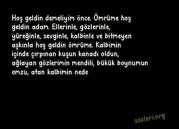 Hoş geldin demeliyim önce. Ömrüme hoş geldin adam. Ellerinle, gözlerinle, yüreğinle, sevginle, kalbinle ve bitmeyen aşkınla hoş geldin ömrüme. Kalbimin içinde çırpınan kuşun kanadı oldun, ağlayan gözlerimin mendili, bükük boynumun omzu, atan kalbimin nede ( Tanışma Yıldönümü )