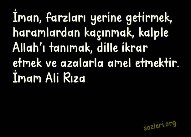 İman, farzları yerine getirmek, haramlardan kaçınmak, kalple Allah’ı tanımak, dille ikrar etmek ve azalarla amel etmektir. İmam Ali Rıza ( Tanımak )