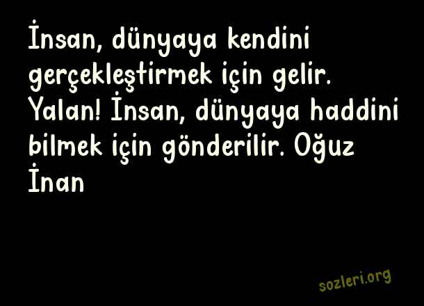 İnsan, dünyaya kendini gerçekleştirmek için gelir. Yalan! İnsan, dünyaya haddini bilmek için gönderilir. Oğuz İnan ( Dünyanın En Güzel )