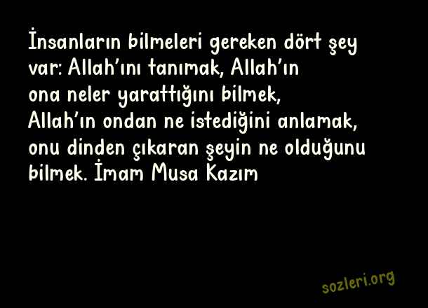 İnsanların bilmeleri gereken dört şey var: Allah’ını tanımak, Allah’ın ona neler yarattığını bilmek, Allah’ın ondan ne istediğini anlamak, onu dinden çıkaran şeyin ne olduğunu bilmek. İmam Musa Kazım ( Tanımak )