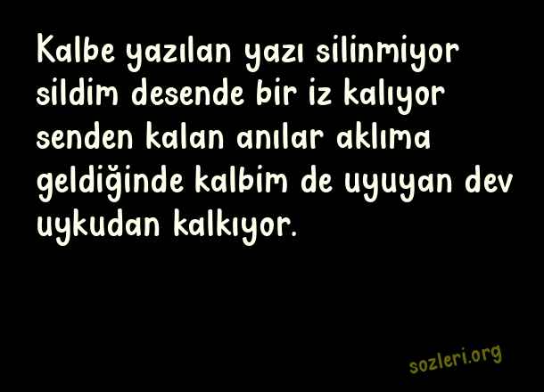 Kalbe yazılan yazı silinmiyor sildim desende bir iz kalıyor senden kalan anılar aklıma geldiğinde kalbim de uyuyan dev uykudan kalkıyor. ( Dayanılmaz Aşk )