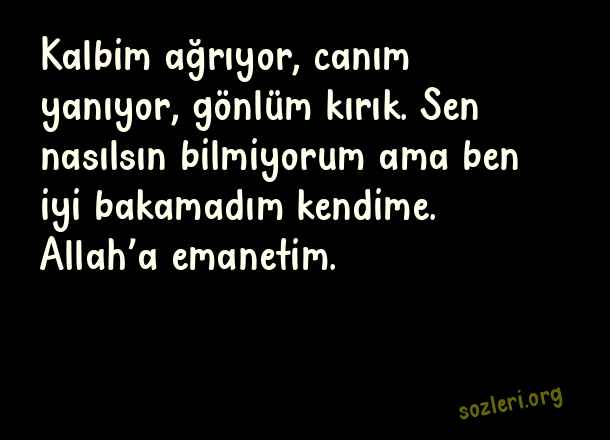 Kalbim ağrıyor, canım yanıyor, gönlüm kırık. Sen nasılsın bilmiyorum ama ben iyi bakamadım kendime. Allah’a emanetim. ( Canım Yanıyor )