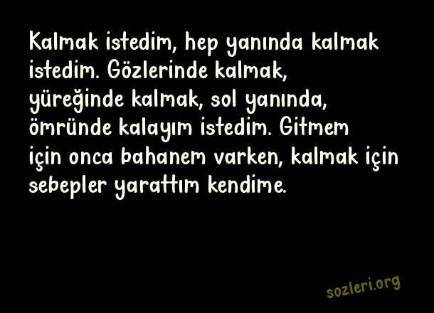 Kalmak istedim, hep yanında kalmak istedim. Gözlerinde kalmak, yüreğinde kalmak, sol yanında, ömründe kalayım istedim. Gitmem için onca bahanem varken, kalmak için sebepler yarattım kendime. ( Yanında Olmak )