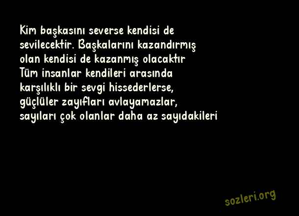 Kim başkasını severse kendisi de sevilecektir. Başkalarını kazandırmış olan kendisi de kazanmış olacaktır… Tüm insanlar kendileri arasında karşılıklı bir sevgi hissederlerse, güçlüler zayıfları avlayamazlar, sayıları çok olanlar daha az sayıdakileri ( Yanılmak )
