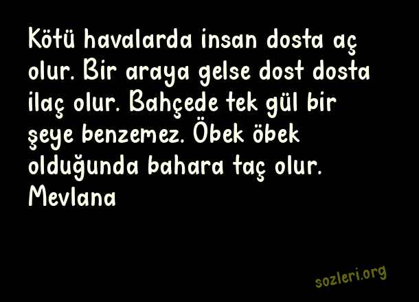 Kötü havalarda insan dosta aç olur. Bir araya gelse dost dosta ilaç olur. Bahçede tek gül bir şeye benzemez. Öbek öbek olduğunda bahara taç olur. Mevlana ( Dayanışma )