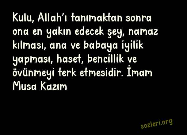 Kulu, Allah’ı tanımaktan sonra ona en yakın edecek şey, namaz kılması, ana ve babaya iyilik yapması, haset, bencillik ve övünmeyi terk etmesidir. İmam Musa Kazım ( Tanımak )
