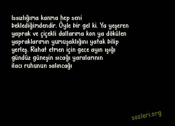 lssızlığıma kanma hep seni beklediğimdendir. Öyle bir gel ki. Ya yeşeren yaprak ve çiçekli dallarıma kon ya dökülen yapraklarımın yumuşaklığını yatak bilip yerleş. Rahat etmen için gece ayın ışığı gündüz güneşin sıcağı yaralarının ilacı ruhunun salıncağı ( Aşk İlanı )