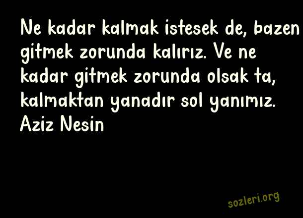 Ne kadar kalmak istesek de, bazen gitmek zorunda kalırız. Ve ne kadar gitmek zorunda olsak ta, kalmaktan yanadır sol yanımız. Aziz Nesin ( Sol Yanım )