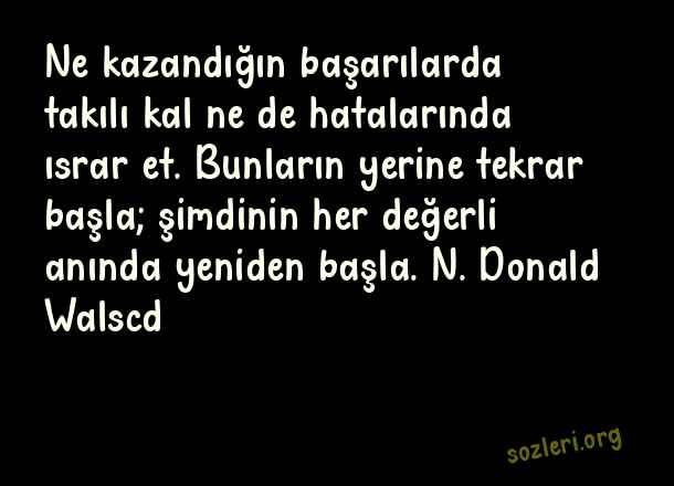 Ne kazandığın başarılarda takılı kal ne de hatalarında ısrar et. Bunların yerine tekrar başla; şimdinin her değerli anında yeniden başla. N. Donald Walscd ( Anı Yaşamak )