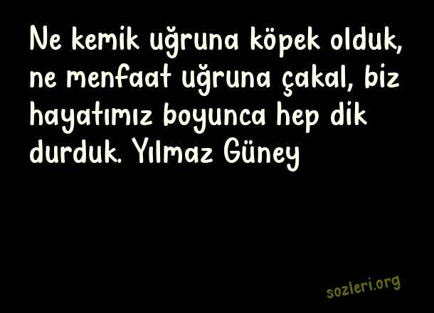 Ne kemik uğruna köpek olduk, ne menfaat uğruna çakal, biz hayatımız boyunca hep dik durduk. Yılmaz Güney ( Kullanılmak )