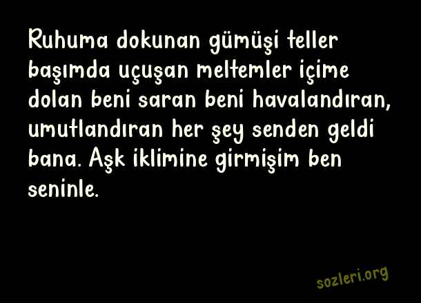 Ruhuma dokunan gümüşi teller başımda uçuşan meltemler içime dolan beni saran beni havalandıran, umutlandıran her şey senden geldi bana. Aşk iklimine girmişim ben seninle. ( Aşk İlanı )