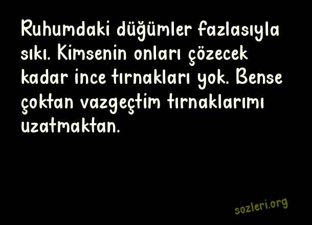 Ruhumdaki düğümler fazlasıyla sıkı. Kimsenin onları çözecek kadar ince tırnakları yok. Bense çoktan vazgeçtim tırnaklarımı uzatmaktan. ( Canım Yanıyor )
