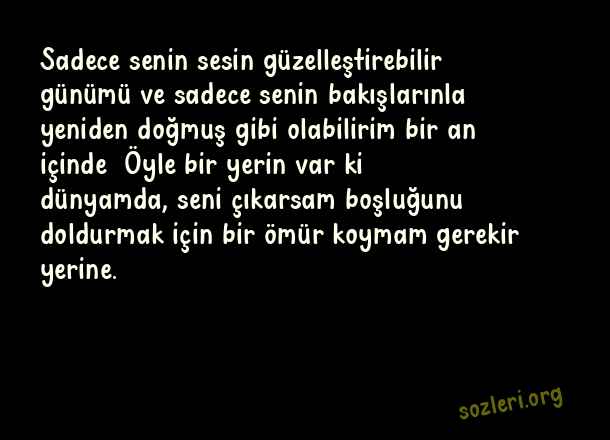Sadece senin sesin güzelleştirebilir günümü ve sadece senin bakışlarınla yeniden doğmuş gibi olabilirim bir an içinde… Öyle bir yerin var ki dünyamda, seni çıkarsam boşluğunu doldurmak için bir ömür koymam gerekir yerine. ( Dünyanın En Romantik )
