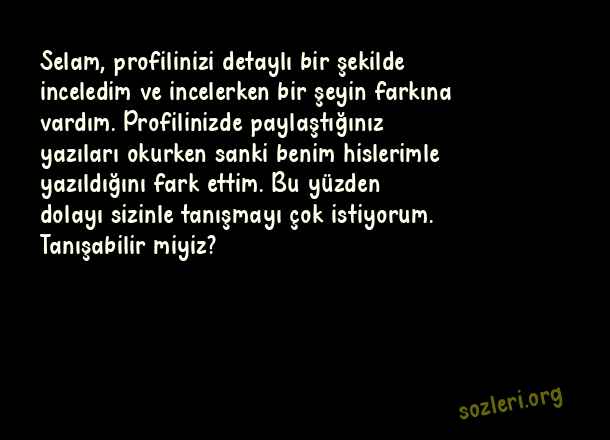 Selam, profilinizi detaylı bir şekilde inceledim ve incelerken bir şeyin farkına vardım. Profilinizde paylaştığınız yazıları okurken sanki benim hislerimle yazıldığını fark ettim. Bu yüzden dolayı sizinle tanışmayı çok istiyorum. Tanışabilir miyiz? ( Tanışma )