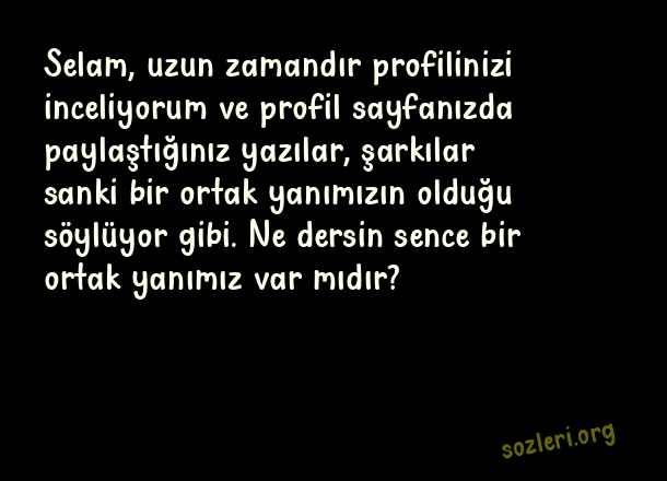 Selam, uzun zamandır profilinizi inceliyorum ve profil sayfanızda paylaştığınız yazılar, şarkılar sanki bir ortak yanımızın olduğu söylüyor gibi. Ne dersin sence bir ortak yanımız var mıdır? ( Tanışma )