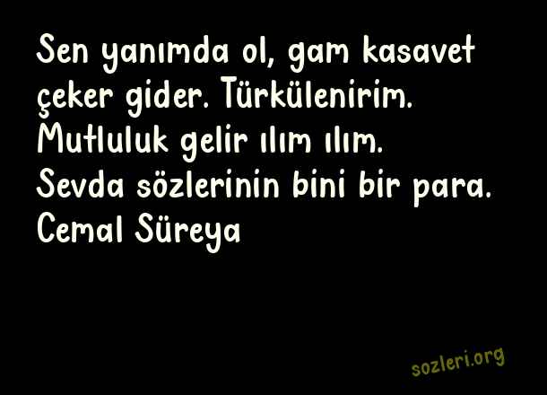 Sen yanımda ol, gam kasavet çeker gider. Türkülenirim. Mutluluk gelir ılım ılım. Sevda sözlerinin bini bir para. Cemal Süreya ( Yanında Olmak )