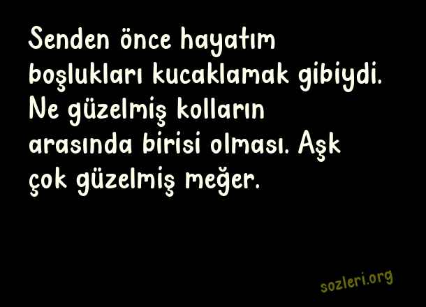 Senden önce hayatım boşlukları kucaklamak gibiydi. Ne güzelmiş kolların arasında birisi olması. Aşk çok güzelmiş meğer. ( Aşk İlanı )