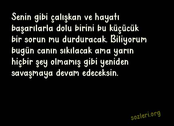 Senin gibi çalışkan ve hayatı başarılarla dolu birini bu küçücük bir sorun mu durduracak. Biliyorum bugün canın sıkılacak ama yarın hiçbir şey olmamış gibi yeniden savaşmaya devam edeceksin. ( Canı Sıkkın Olanlara Sözler )