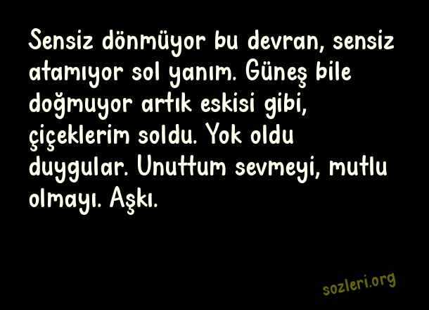 Sensiz dönmüyor bu devran, sensiz atamıyor sol yanım. Güneş bile doğmuyor artık eskisi gibi, çiçeklerim soldu. Yok oldu duygular. Unuttum sevmeyi, mutlu olmayı. Aşkı. ( Sol Yanım )
