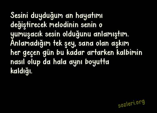 Sesini duyduğum an hayatımı değiştirecek melodinin senin o yumuşacık sesin olduğunu anlamıştım. Anlamadığım tek şey, sana olan aşkım her geçen gün bu kadar artarken kalbimin nasıl olup da hala aynı boyutta kaldığı. ( Dünyanın En Romantik )