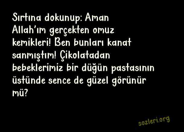 Sırtına dokunup: Aman Allah’ım gerçekten omuz kemikleri! Ben bunları kanat sanmıştım! Çikolatadan bebeklerimiz bir düğün pastasının üstünde sence de güzel görünür mü? ( Tanışma )