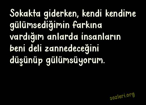 Sokakta giderken, kendi kendime gülümsediğimin farkına vardığım anlarda insanların beni deli zannedeceğini düşünüp gülümsüyorum. ( Orhan Veli Kanık )