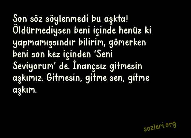 Son söz söylenmedi bu aşkta! Öldürmediysen beni içinde henüz ki yapmamışsındır bilirim, gömerken beni son kez içinden ‘Seni Seviyorum’ de. İnançsız gitmesin aşkımız. Gitmesin, gitme sen, gitme aşkım. ( Canım Yanıyor )