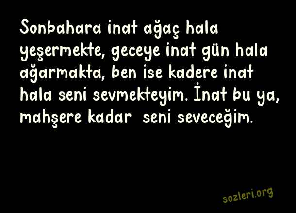 Sonbahara inat ağaç hala yeşermekte, geceye inat gün hala ağarmakta, ben ise kadere inat hala seni sevmekteyim. İnat bu ya, mahşere kadar seni seveceğim. ( Tanışma Yıldönümü )
