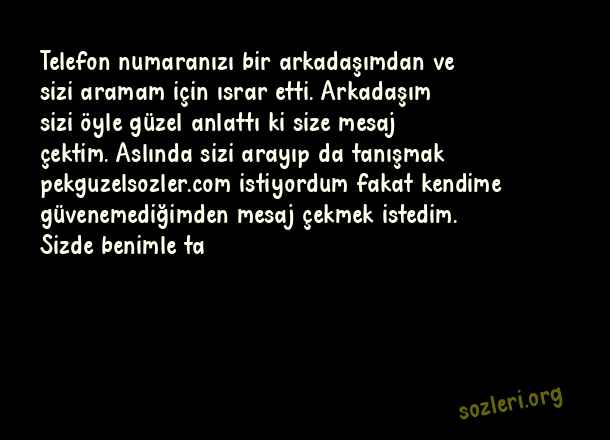 Telefon numaranızı bir arkadaşımdan ve sizi aramam için ısrar etti. Arkadaşım sizi öyle güzel anlattı ki size mesaj çektim. Aslında sizi arayıp da tanışmak istiyordum fakat kendime güvenemediğimden mesaj çekmek istedim. Sizde benimle ta ( Tanışma )