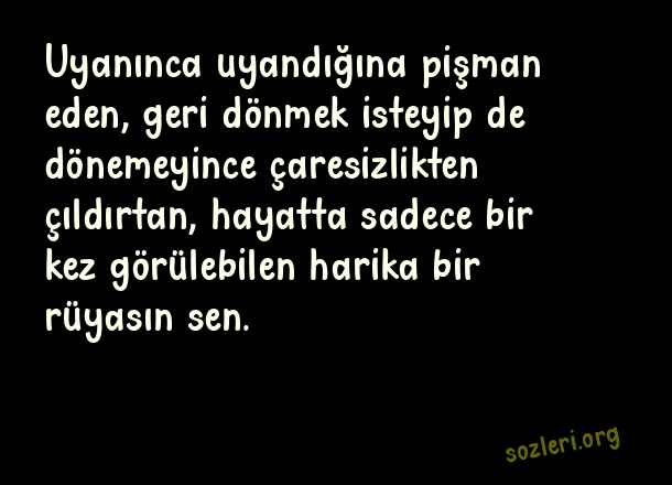 Uyanınca uyandığına pişman eden, geri dönmek isteyip de dönemeyince çaresizlikten çıldırtan, hayatta sadece bir kez görülebilen harika bir rüyasın sen. ( Dünyanın En Güzel )